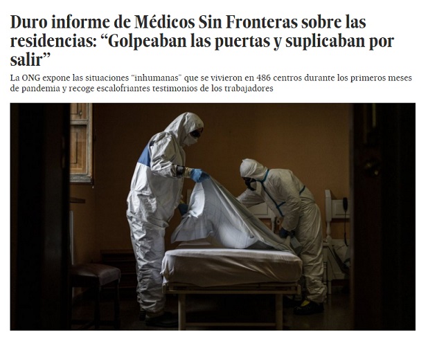 Médicos Sin Fronteras imputa al abandono las muertes de 27.000 ancianos en los asilos durante el estado de alarma, según un informe presentado el pasado lunes.